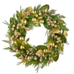 Raz 24″ Snowy Mixed Greenery And Blue And Gold Ornament Christmas Wreath W4302540