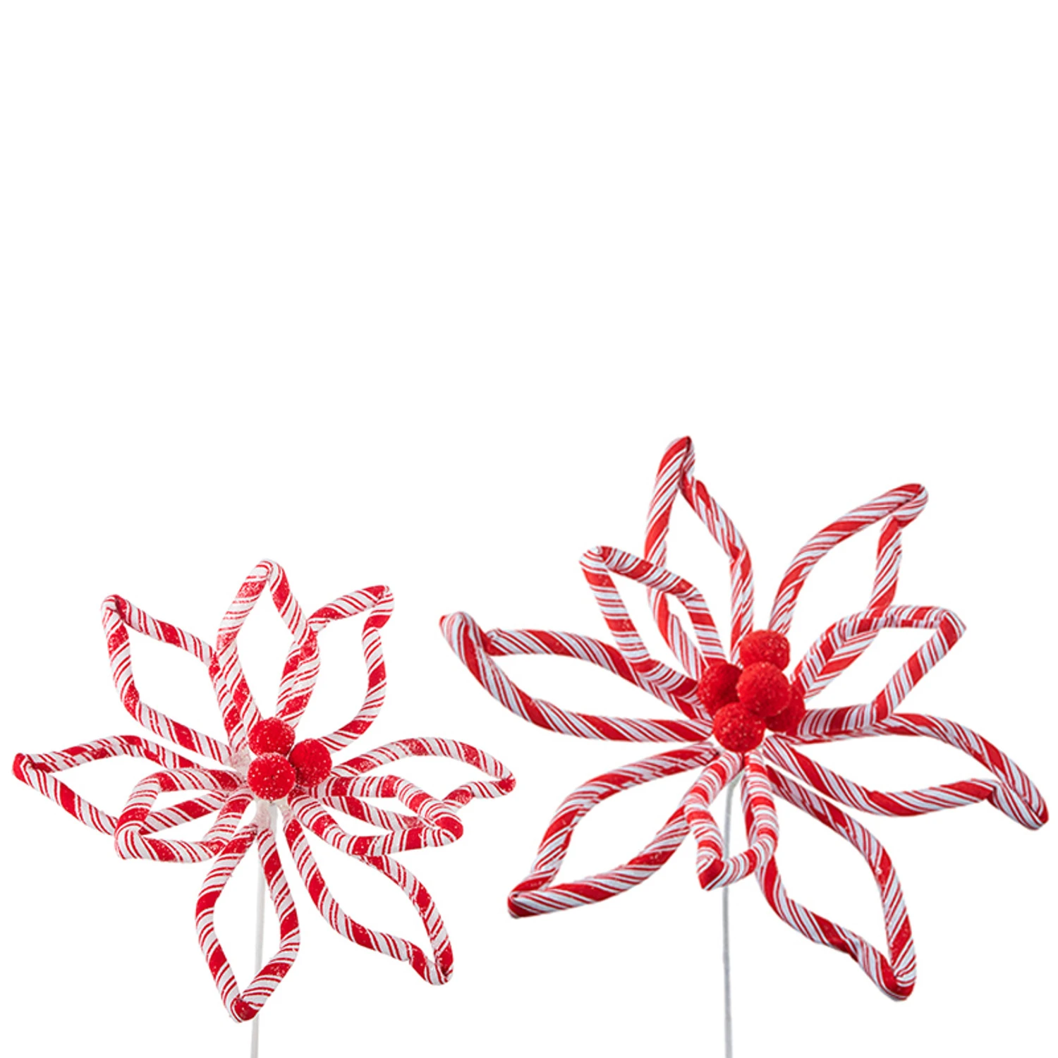This gorgeous poinsettia! Each leaf is made of a peppermint striped candy and the center has red pom-pom balls covered in glitter! Made by Raz Imports. Made of polyester. Dimensions: 16.5″ or 24.5″. Item #: F4206712 or F4206721
