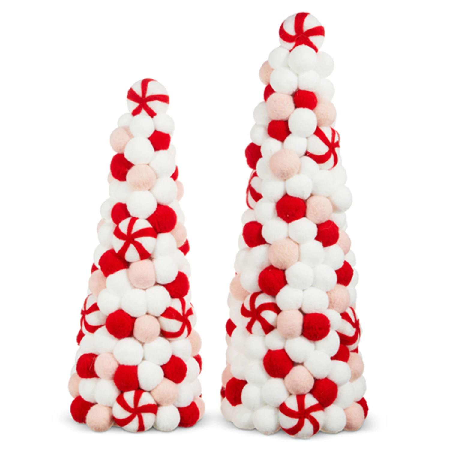 These cuties are sure to look perfect in your home this holiday! Each tree features light pink, white, red and peppermint candy pom pom balls! These will look fabulous up on your mantle or on your coffee table! Sold as a set of 2. Made by Raz Imports. Made of foam, polyester, and wool. Dimensions: 6.5″D X 17.75″H; 6″D X 14.5″H. Item #: 4316147