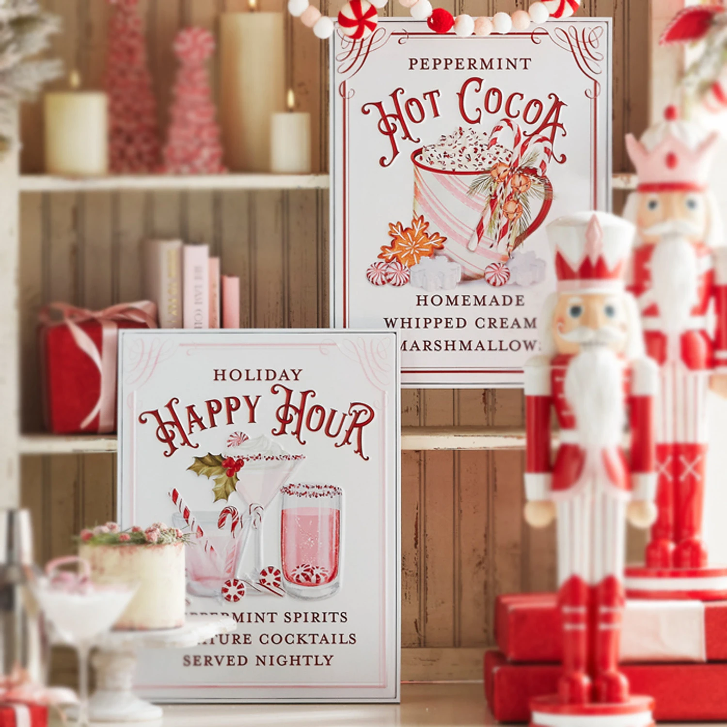 Be in high *spirits* this holiday season! Celebrate your friends and family with a drink…or two! Each sign is a pretty white with pink and red accents with peppermint drinks on the front and adorable Christmas sayings! Choose between the Christmas cocktails sign or the hot cocoa sign. Each sold individually. Made by Raz Imports. Made of metal. Dimensions: 13.75″L X 0.75″W X 18″H. Item #: 4359013