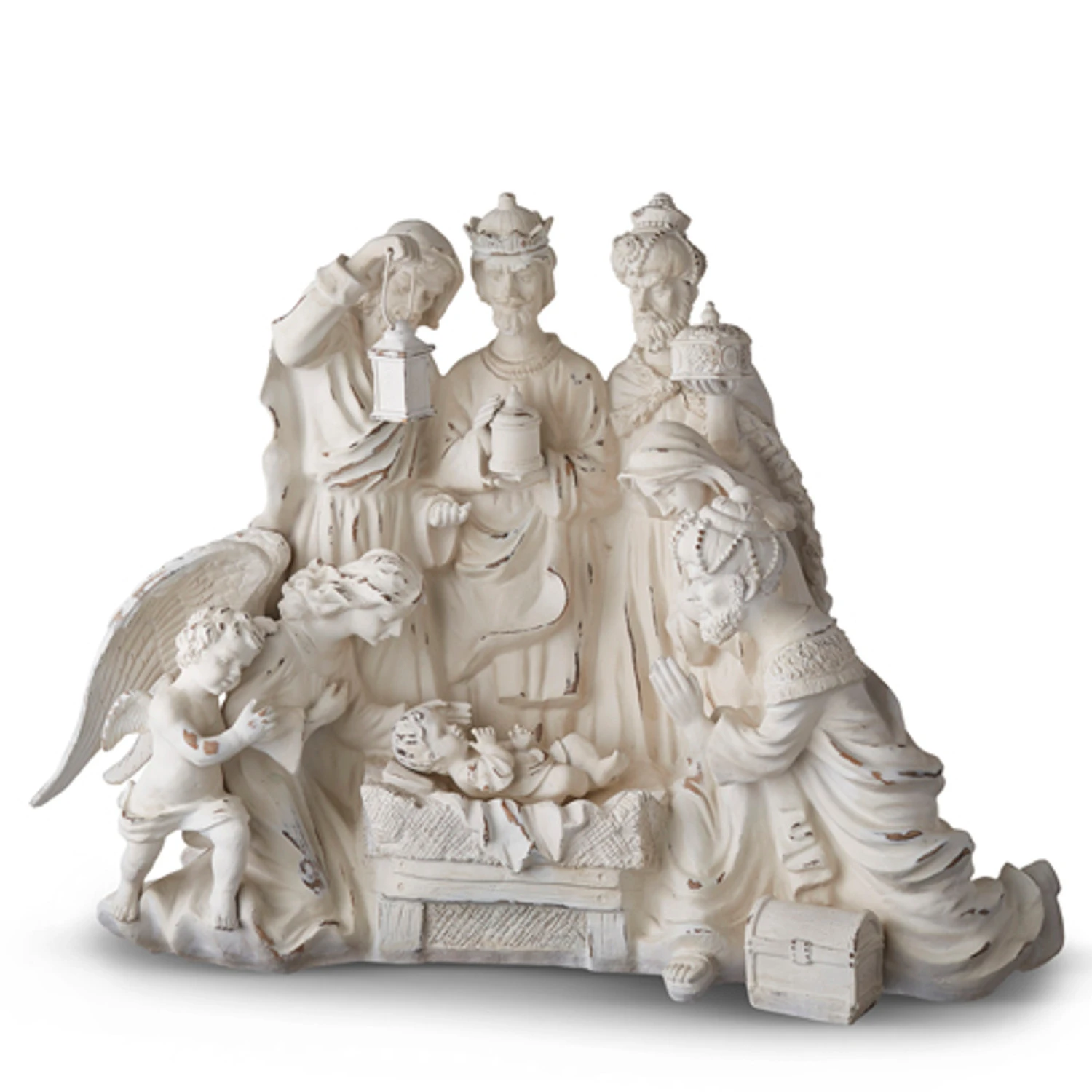 Celebrate the reason for the season with this fantastic nativity scene. It features the holy family knelt over baby Jesus surrounded by the three wisemen and a pair of angels. The figure is a beautiful white with distressing detail. Perfect to place on a console table or next to your Christmas tree! Made by Raz Imports. Made of resin. Dimensions: 27.75″ L X 10.75″ W X 20.75″ H. Item #: 4211152