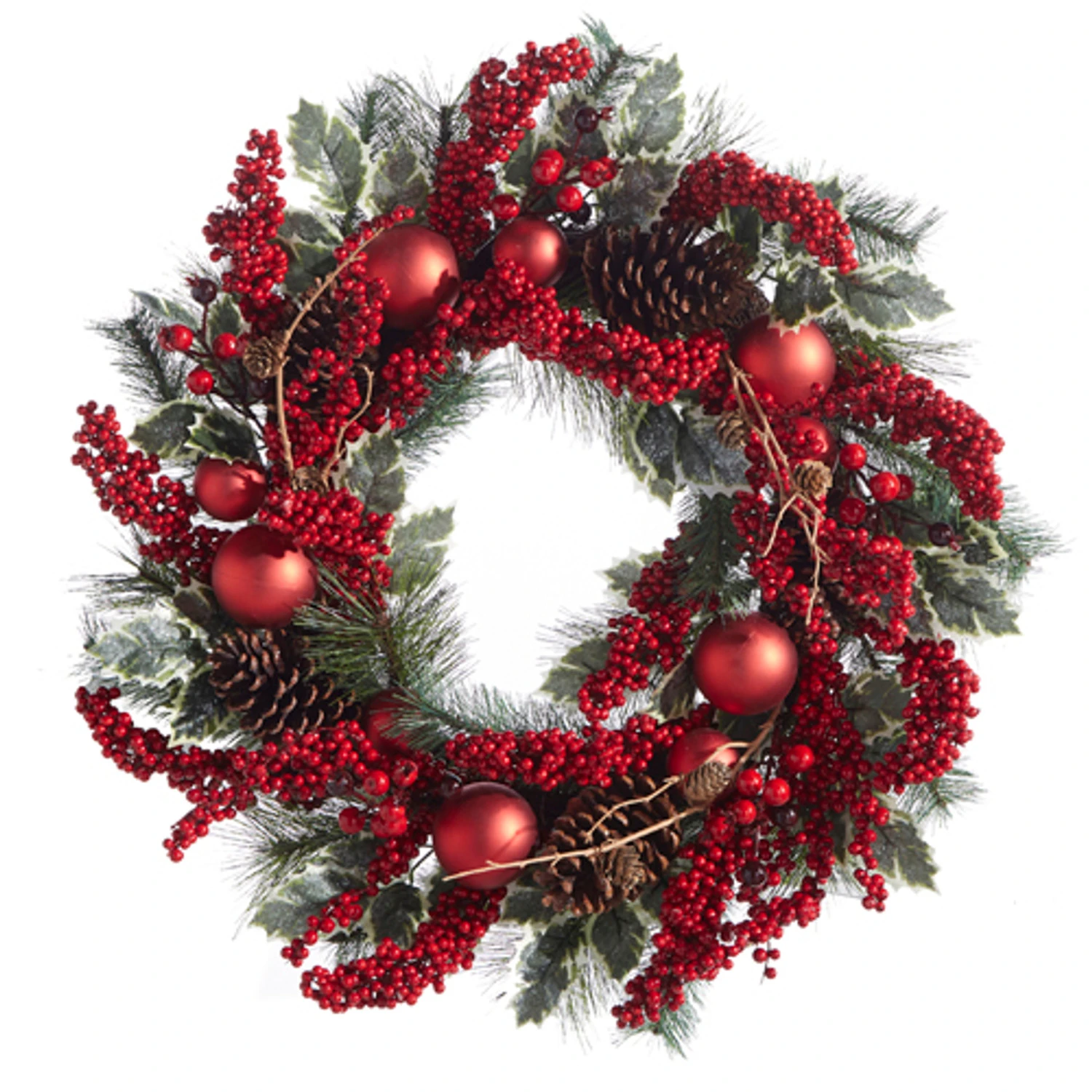 This stunning wreath features mixed greenery dusted with ice, red berries of different sizes, dried pinecones, vines, and bright red ball ornaments! All the work is done with this pre-decorated wreath, simply hang it up and enjoy! Made by Raz Imports. Made of plastic and polyester. Dimensions: 28″. Item #: W4302480Â