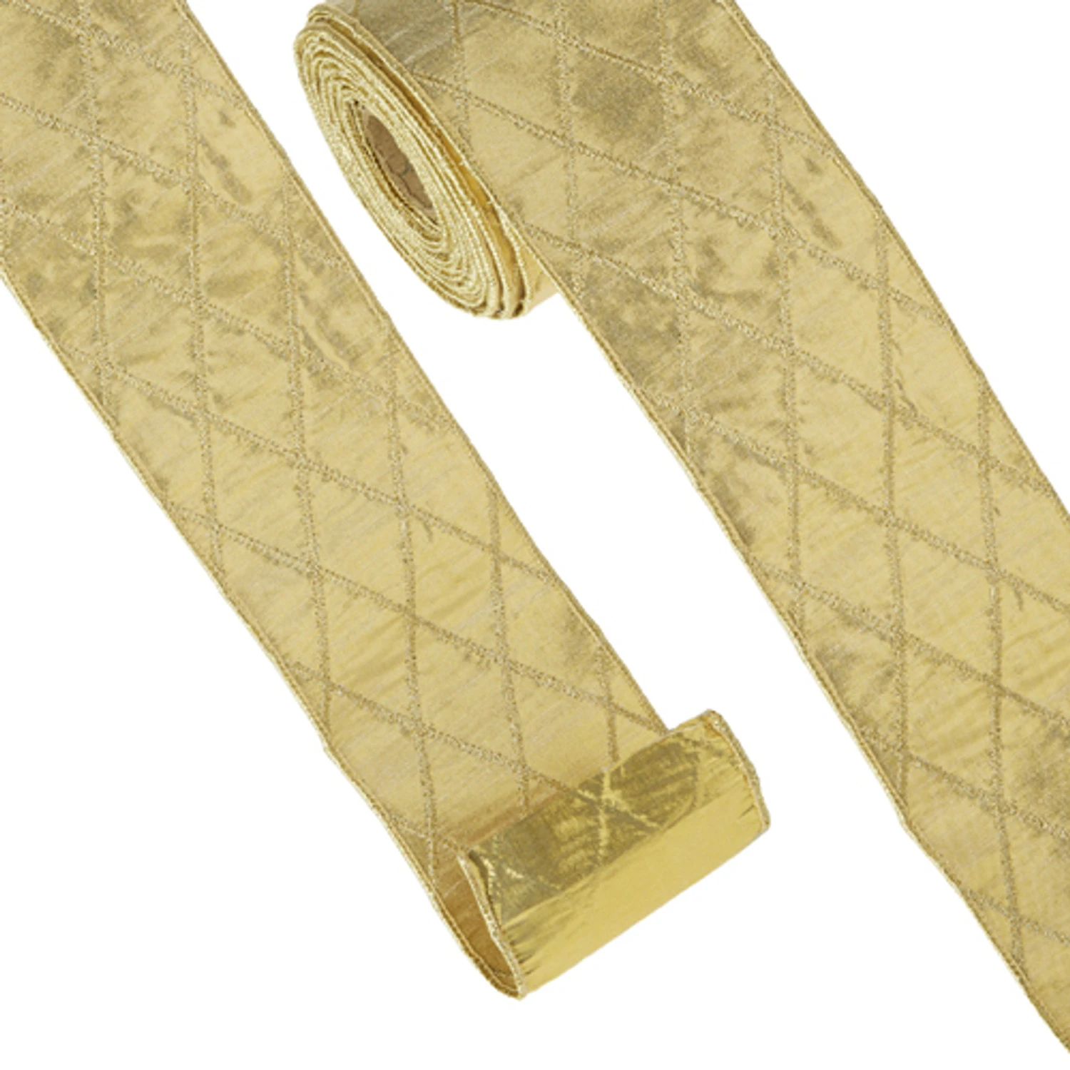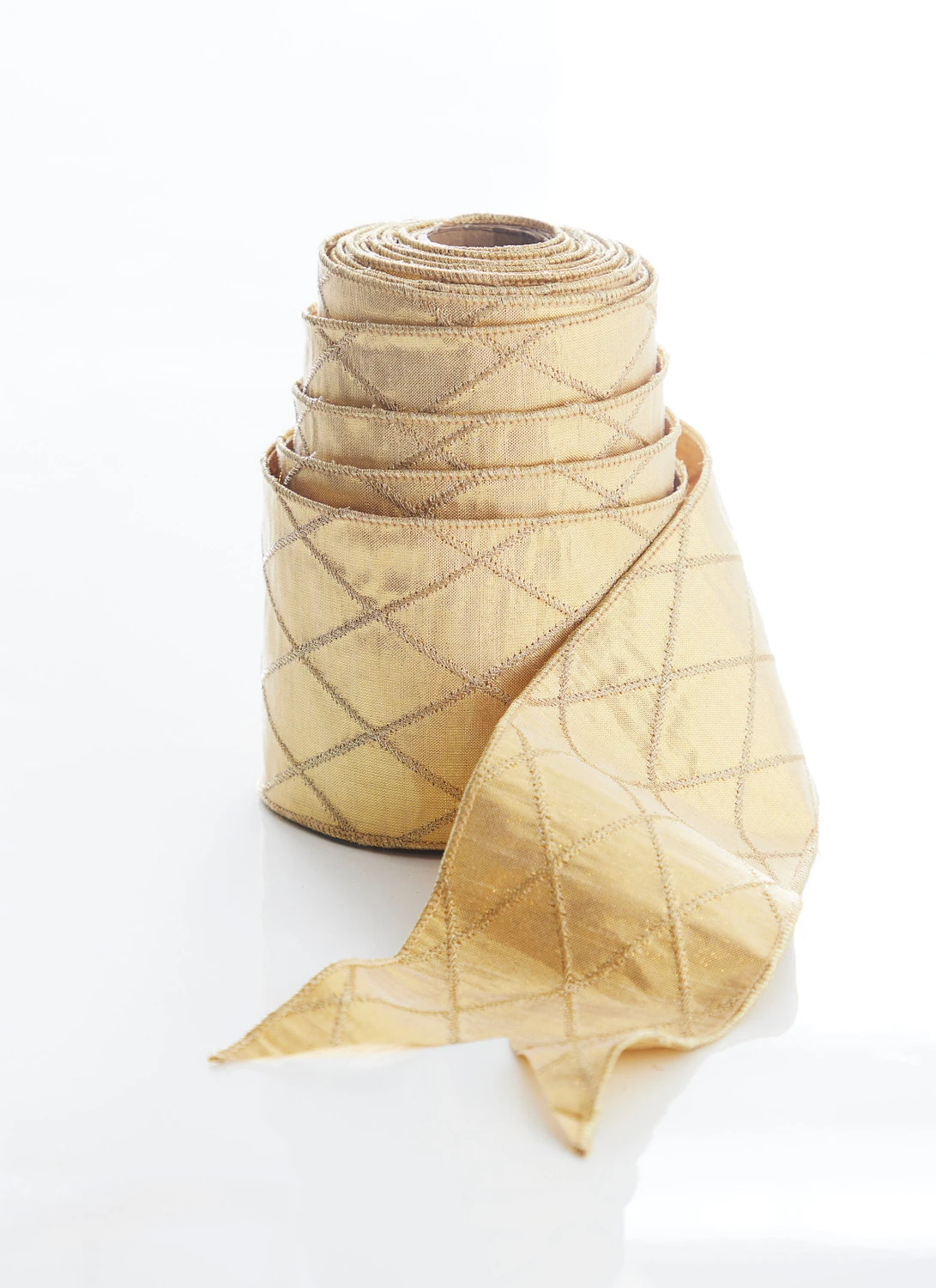 This ribbon is fit for a princess! If features metallic gold fabric with diamond shapes sewn into the fabric! Made by Raz Imports. Made of polyester. Dimensions: 4″ x 10 yards. Item #: R4371770