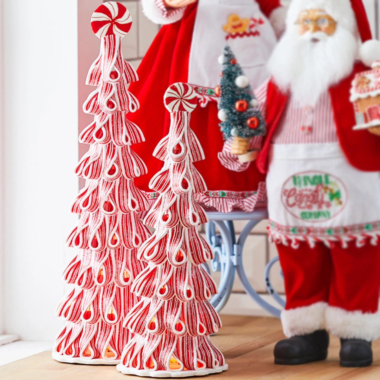 Turn your mantle into a peppermint candy wonderland! This pair of trees feature ribbons of peppermint candy piled on top of one another to create gorgeous trees topped with round peppermints! Both trees are dusted with an iridescent glitter! Sold as a set of 2. Made by Raz Imports. Made of claydough. Dimensions: 5.75″D x 17.25″H; 5.25″D x 13.5″H. Item #: 4014108