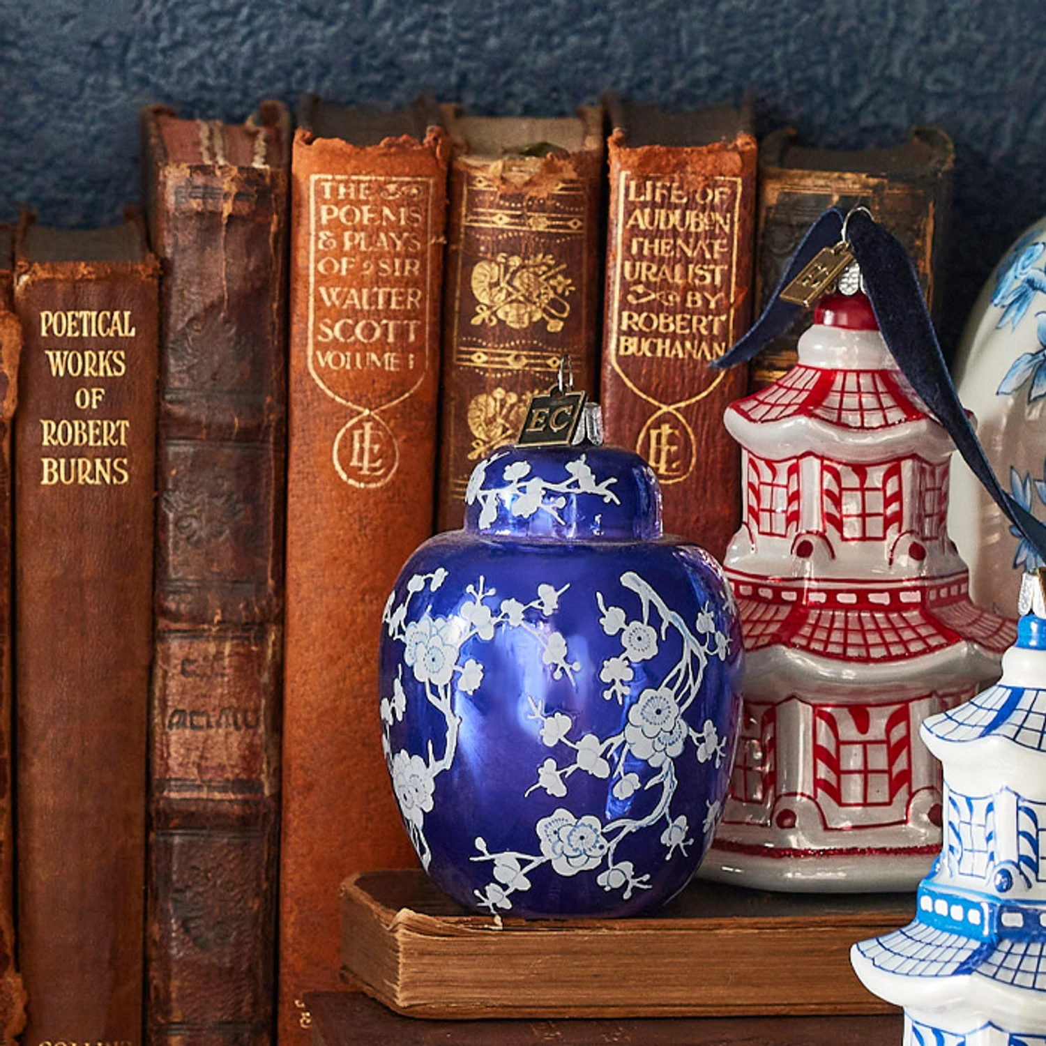Add a touch of elegance and class with this ornament! It features a blue glass vase shape with white cherry blossom branches and lowers! Made by Raz Imports. Made of glass. Dimensions: 5″ D X 6.5″ H. Item #: 4353180